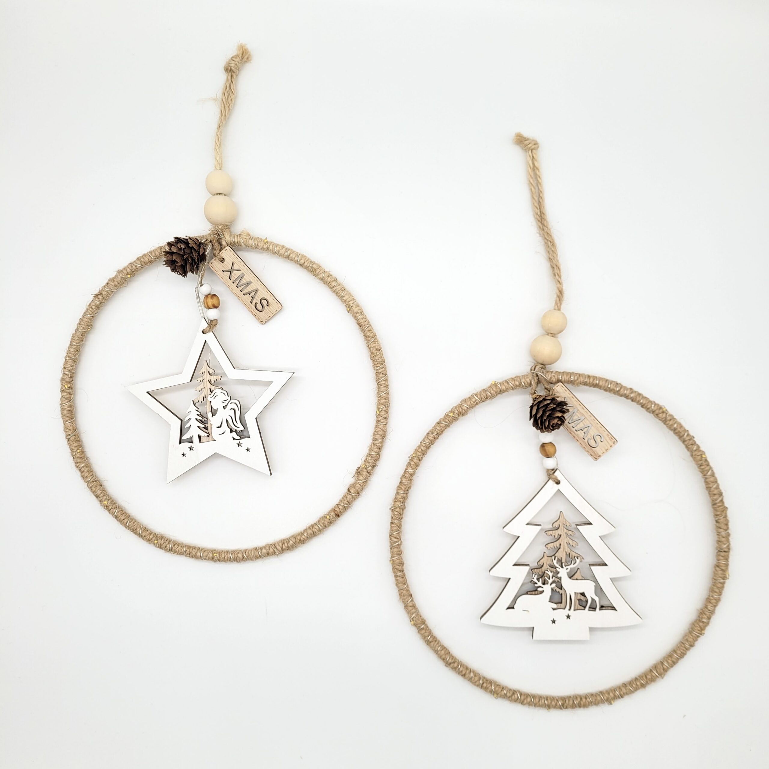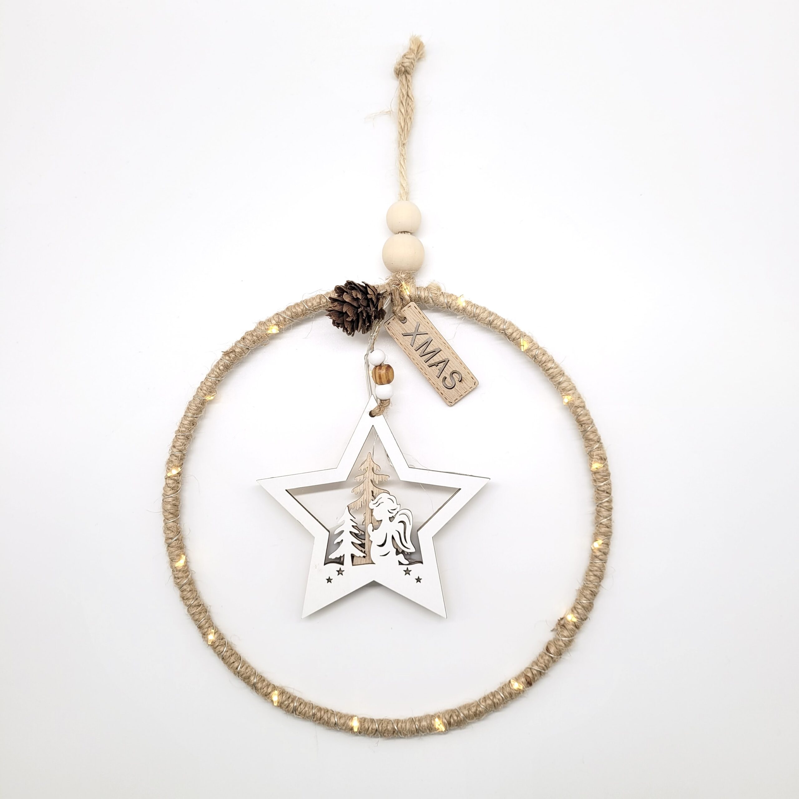 Material: Metall, Jute, Holz, warmweiße LED-Lichterkette (2 Knopfzell-Batterien im Lieferumfang enthalten)