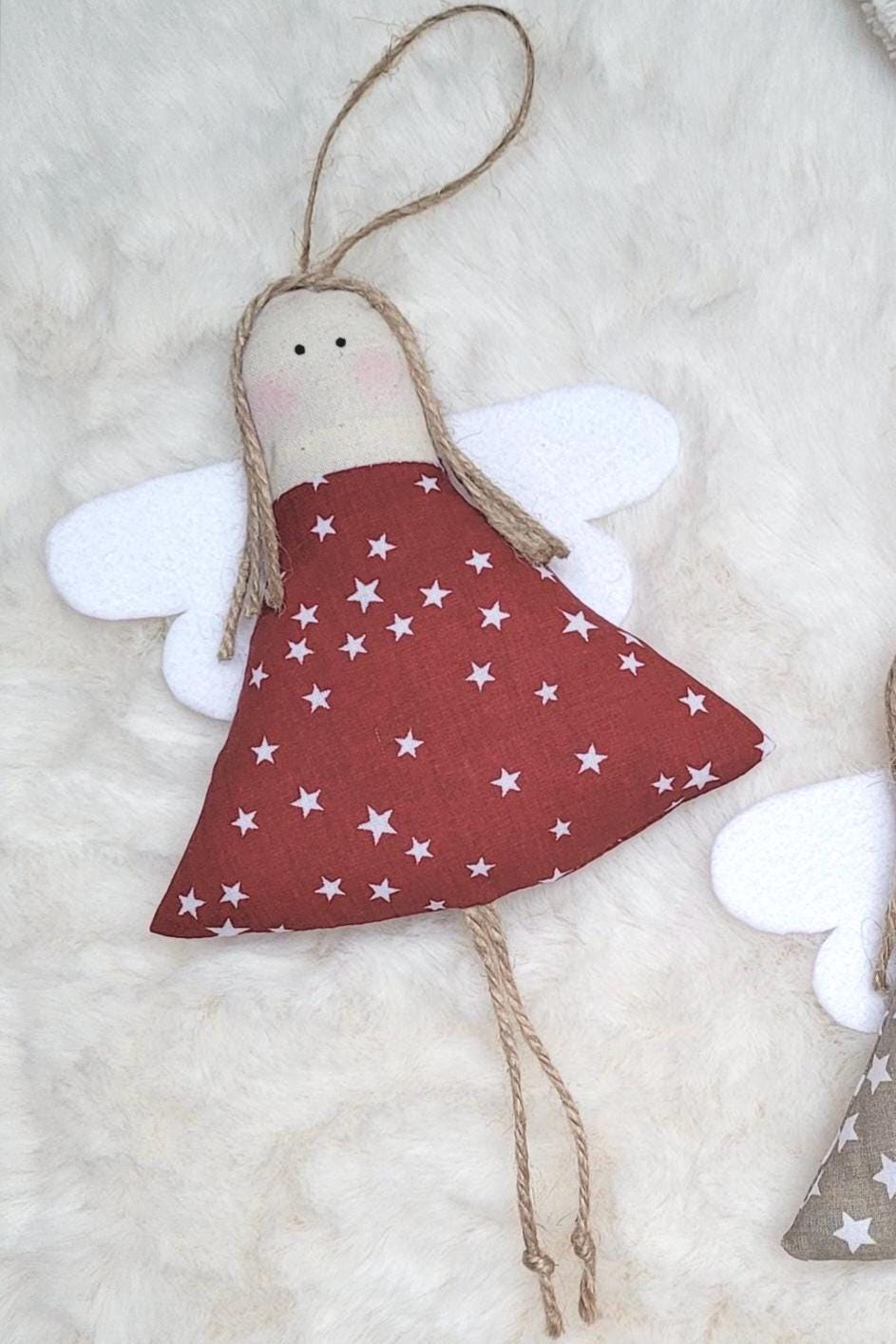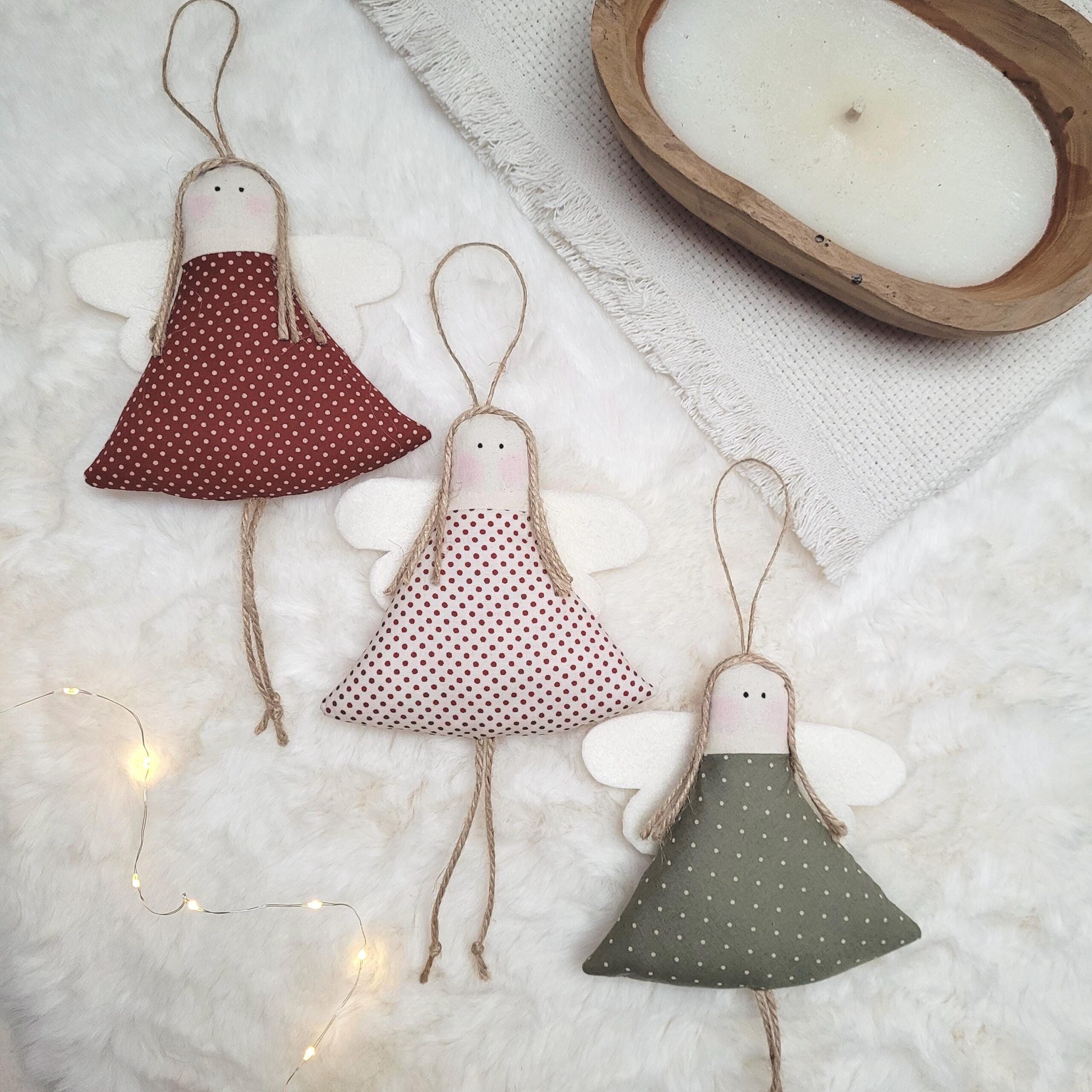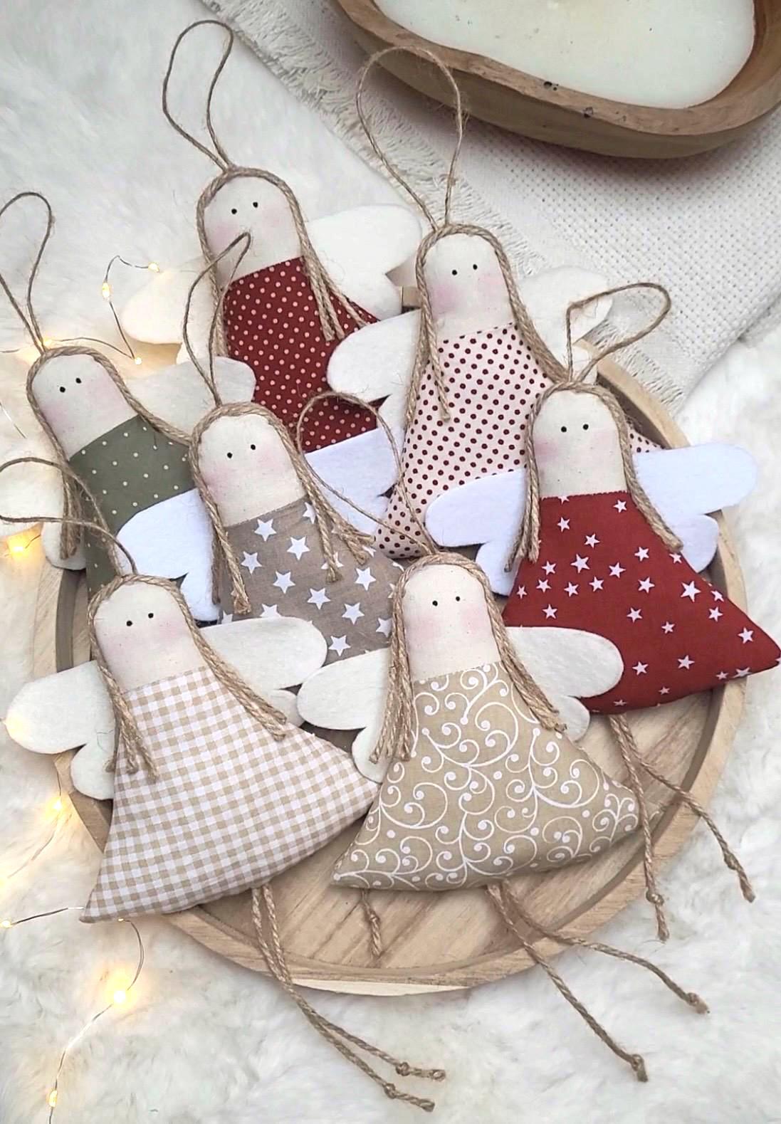 Handgemachter Weihnachtsengel aus Baumwollstoff als rustikale Landhausdeko, Christbaumschmuck & Fensterdeko in verschiedenen Stoffvarianten. Jeder Engel ist ca. 30 cm lang, liebevoll genäht und einzigartig unter anderem durch sein handgemaltes Gesicht. Haare, Beine & Aufhängung aus sind aus Jute, die Flügel aus cremefarbenem oder weißem Filz, was den Engeln einen rustikalen Touch verleiht. Durch das Tilda-ähnliche Design ist jeder Engel etwas ganz besonderes.