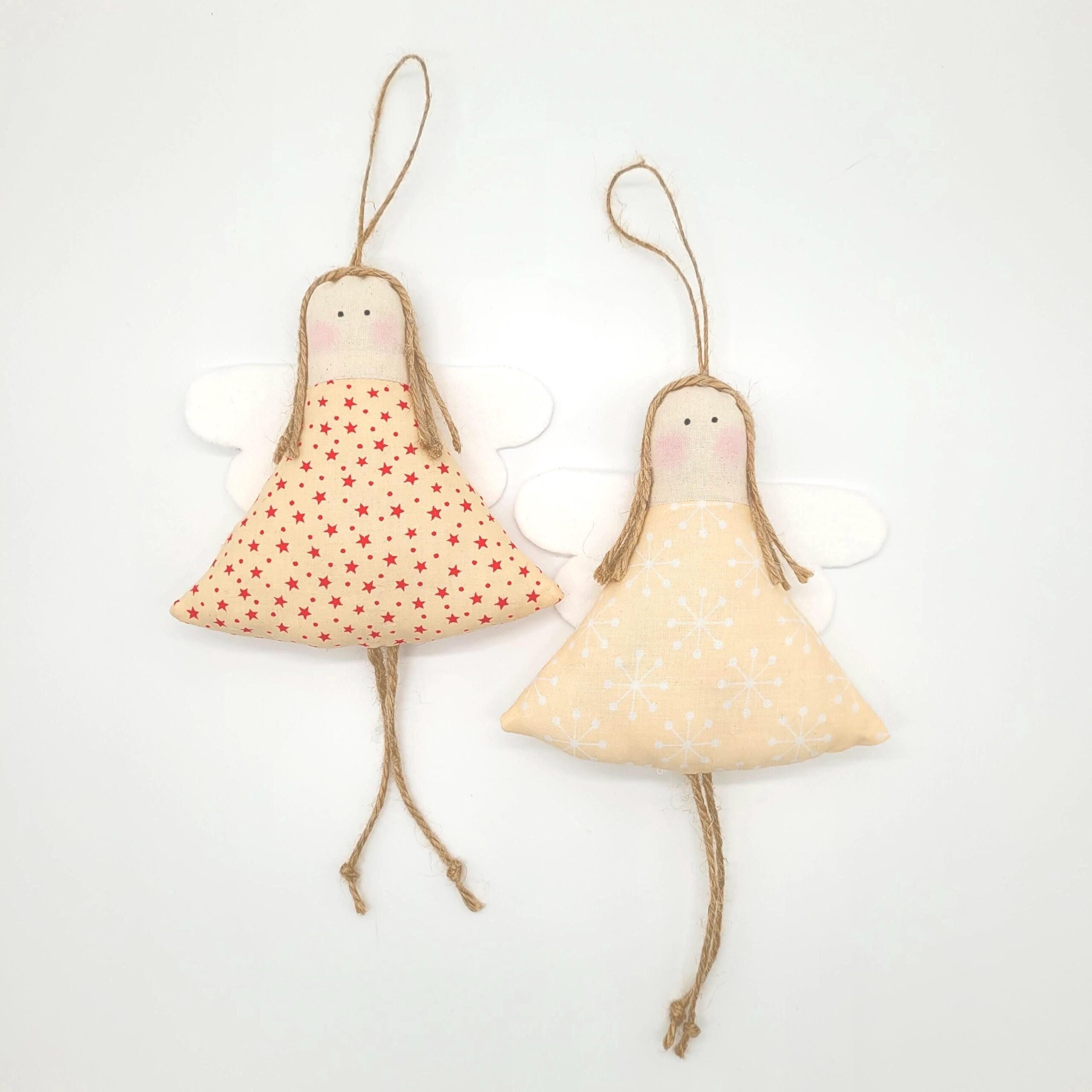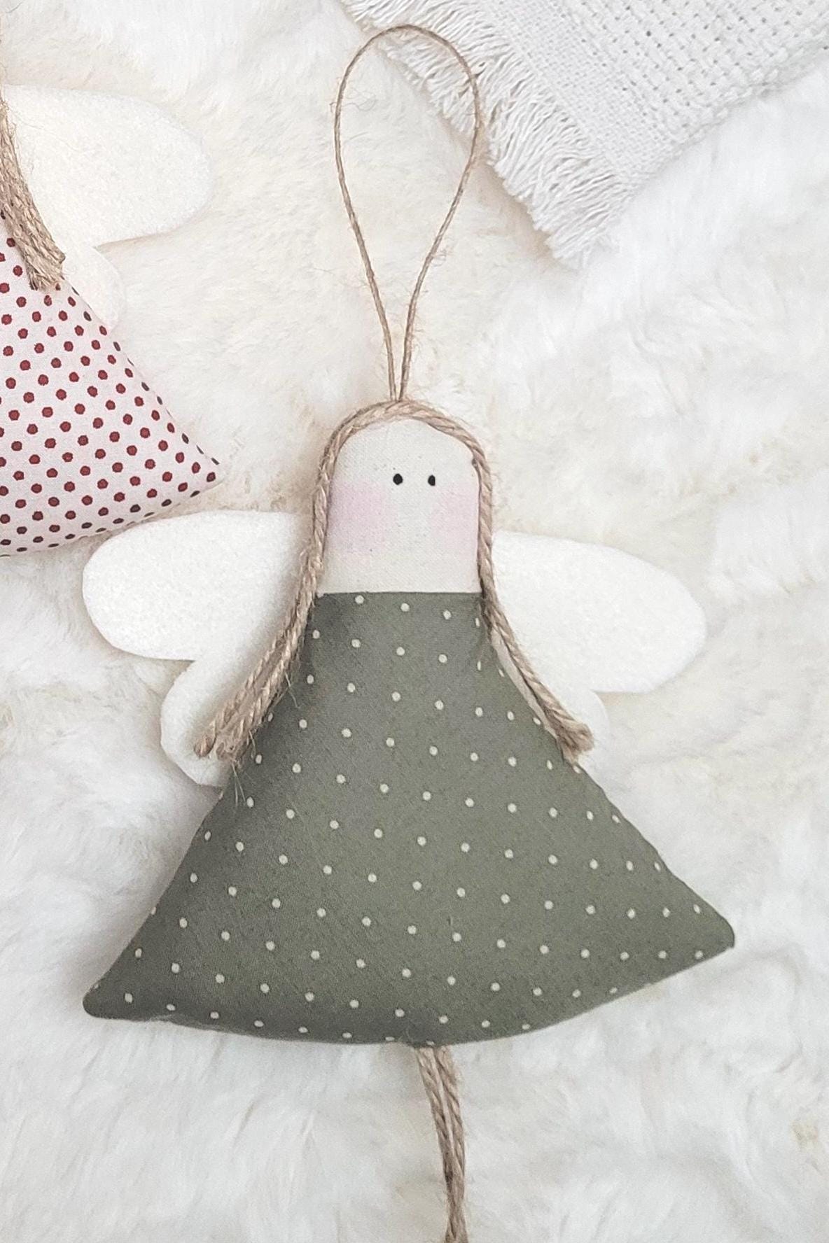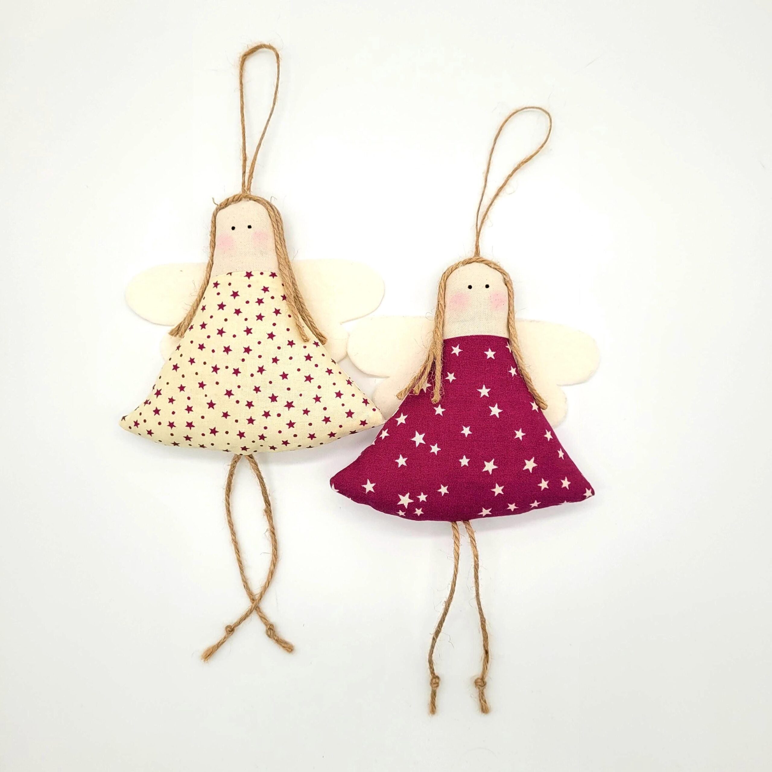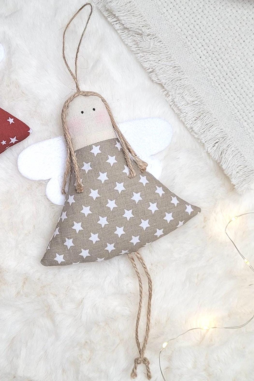 Handgemachter Weihnachtsengel aus Baumwollstoff als rustikale Landhausdeko, Christbaumschmuck & Fensterdeko in verschiedenen Stoffvarianten. Jeder Engel ist ca. 30 cm lang, liebevoll genäht und einzigartig unter anderem durch sein handgemaltes Gesicht. Haare, Beine & Aufhängung aus sind aus Jute, die Flügel aus cremefarbenem oder weißem Filz, was den Engeln einen rustikalen Touch verleiht. Durch das Tilda-ähnliche Design ist jeder Engel etwas ganz besonderes.
