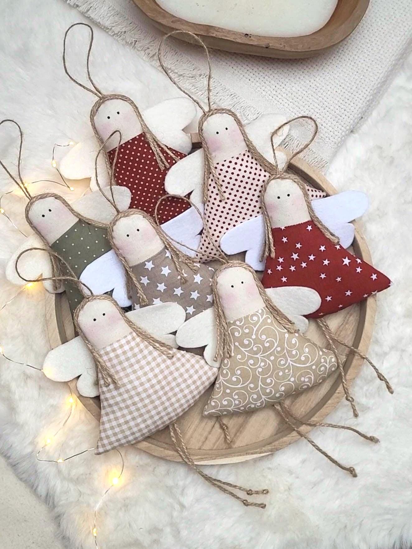 Du kannst zwischen verschiedenen Stoffmustern und Farben wählen: Punkte, Sterne oder Karos in klassischen Weihnachtsfarben wie Rot, Grün, Taupe oder Beige. Jeder Engel in liebevoller Handarbeit von mir angefertigt und wird einzeln oder im Set angeboten. Jedes Paket kommt sorgfältig in Holzwolle & Seidenpapier verpackt – perfekt zum direkten Verschenken.